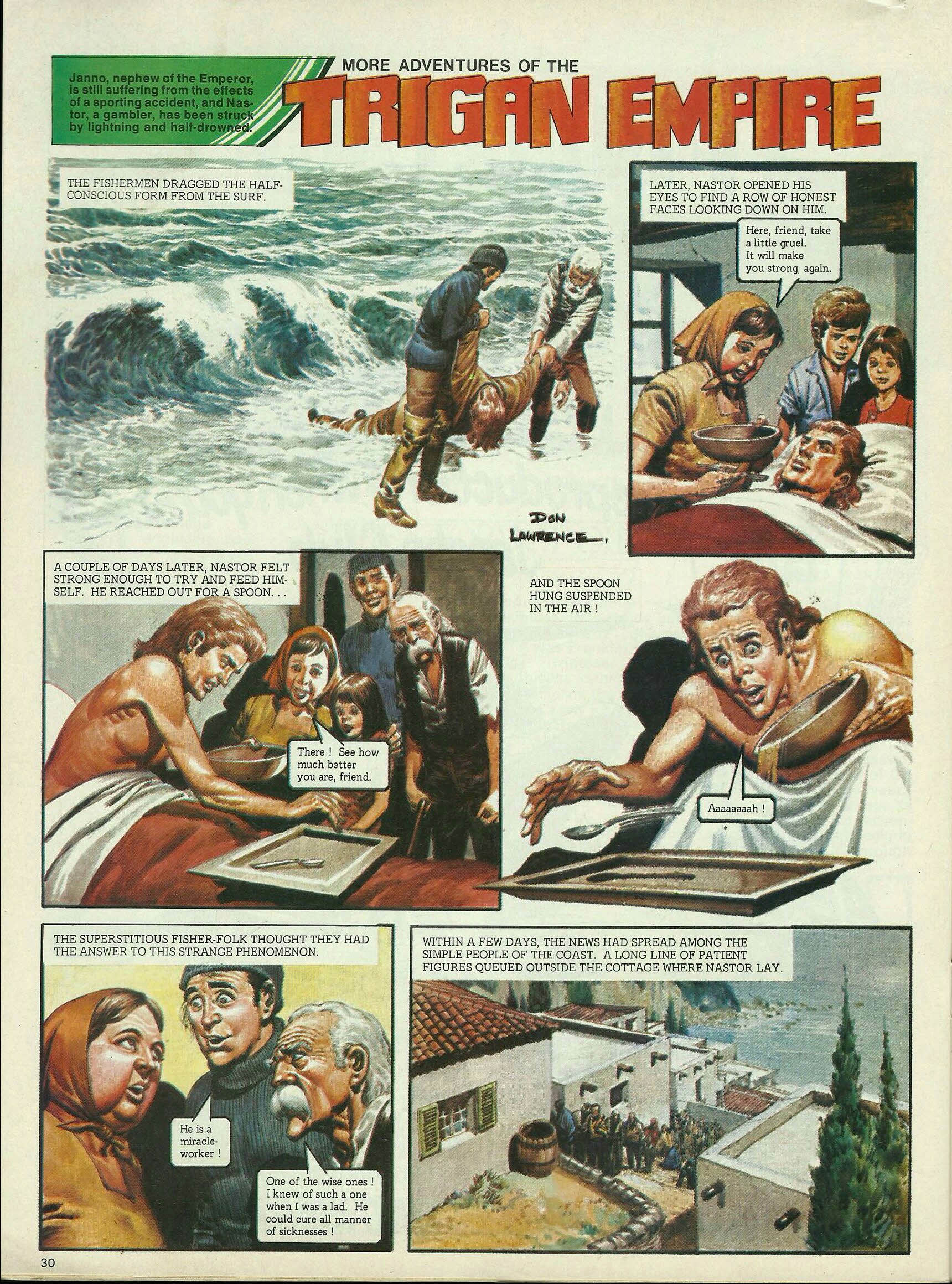 The fishermen dragged the half- conscious form from the surf. Later, Nastor opened his eyes to find a row of honest faces looking down on him. Here, friend, take a little gruel. It will make you strong again. A couple of days later, Nastor felt strong enough to try and feed himself. He reached out for a spoon . . . There ! See how much better you are, friend. And the spoon hung suspended in the air ! Aaaaaaaah ! The superstitious fisher-folk thought they had the answer to this strange phenomenon. He is a miracle- worker ! One of the wise ones ! I knew of such a one when I was a lad. He could cure all manner of sicknesses ! Within a few days, the news had spread among the simple people of the coast. A long line of patient figures queued outside the cottage where Nastor lay.
