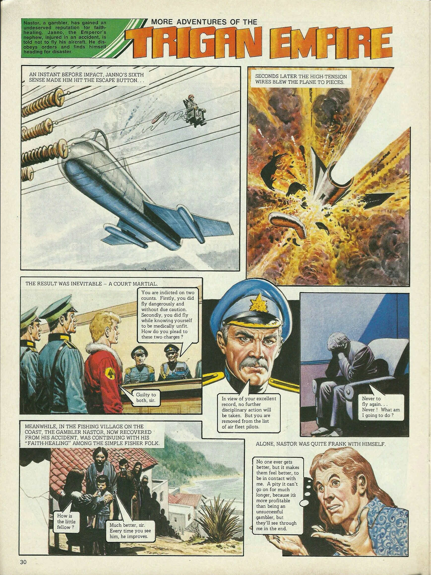 Touch my son and make him well again, sir. I beg of you. All the people asked of Nastor was the touch of his hand or a few words of comfort, then they departed happily, leaving behind a few coins or some food. I feel better already, sir. I’m pleased to hear it. The simple folk would have been surprised to know the thoughts that were passing through the “wise one’s” mind. I don’t know how long these stupid fools are going to treat me like some kind of god, but I’ll stay here until I get my strength back and at the same time make some money on the side. Meanwhile, in Trigan City Air Fleet base, Janno was making one last desperate bid to continue his career as a pilot. Janno, you’re in no fit state to fly with those blinding headaches. Why not take a year’s leave and get fit again. I’m better, I tell you, Keren ! And I’ll prove it . . . today ! Janno’s proof of his fitness to fly was a demonstration of low-level aerobatics that had the whole base staring in awe. But, in the cockpit . . . Aaaaah ! My head ! The agony ! Blinded by the pain, Janno never saw his peril . . . He’s going to crash into the high-tension wires !