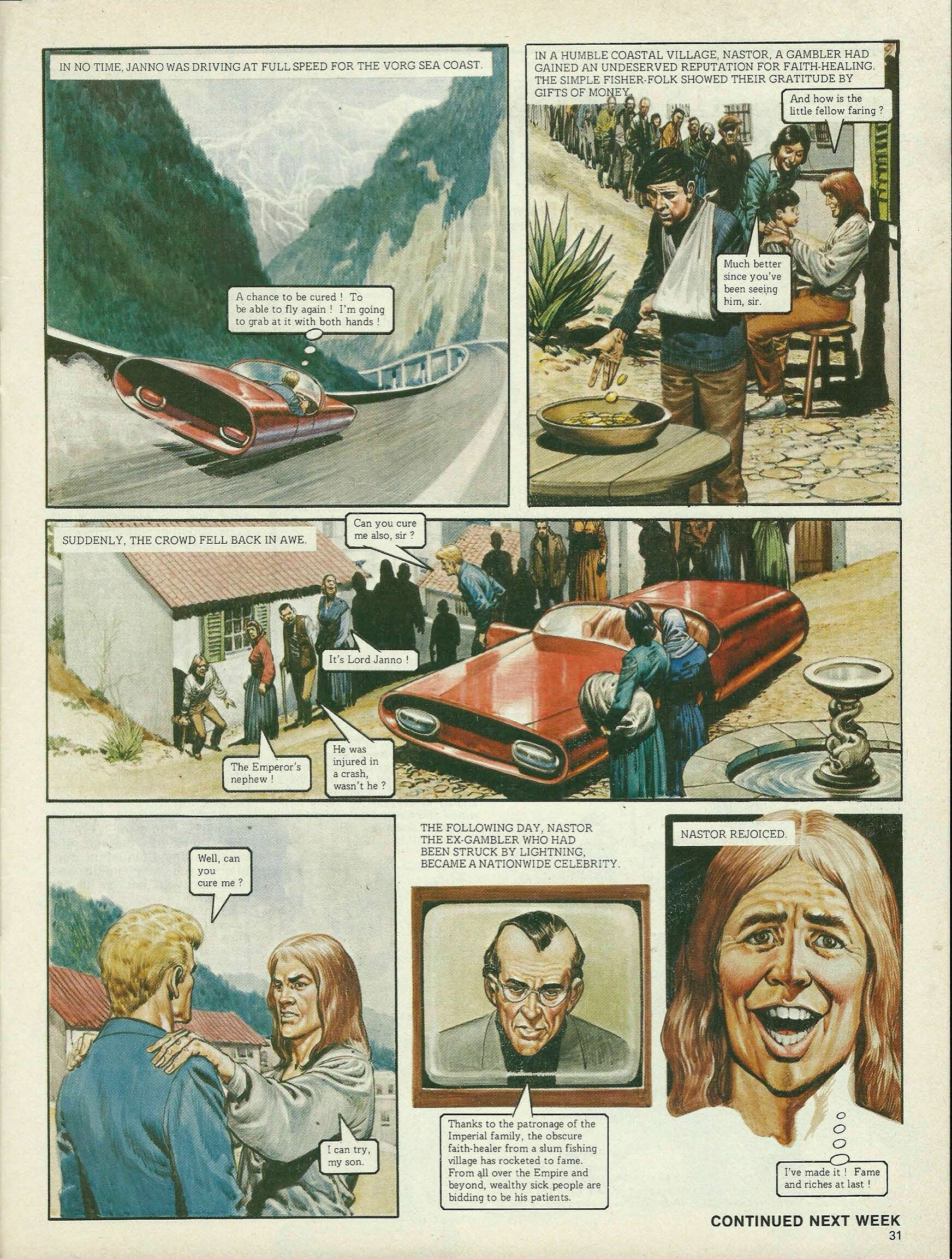 In no time, Janno was driving at full speed for the Vorg sea coast. A chance to be cured ! To be able to fly again ! I’m going to grab at it with both hands ! In a humble coastal village, Nastor, a gambler had gained an undeserved reputation for faith-healing. The simple fisher-folk showed their gratitude by gifts of money. And how is the little fellow faring ? Much better since you’ve been seeing him, sir. Suddenly, the crowd fell back in awe. Can you cure me also, sir ? It’s Lord Janno ! The Emperor’s nephew ! He was injured in a crash, wasn’t he ? Well, can you cure me ? I can try, my son. The following day, Nastor the ex-gambler who had been struck by lightning, became a nationwide celebrity. Thanks to the patronage of the Imperial family, the obscure faith-healer from a slum fishing village has rocketed to fame. From all over the Empire and beyond, wealthy sick people are bidding to be his patients. Nastor rejoiced. I’ve made it ! Fame and riches at last !