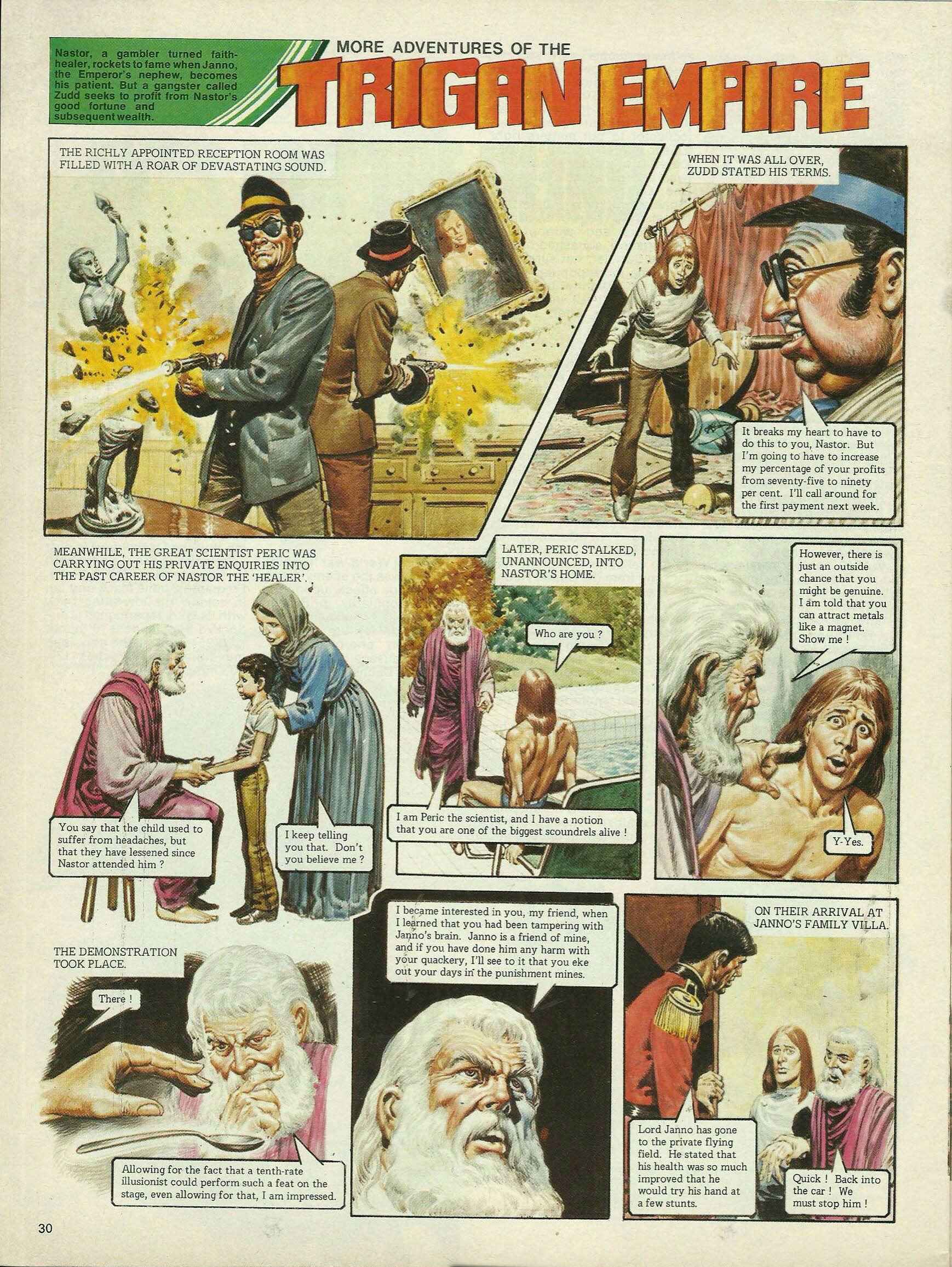 Posted on November 22, 2025November 22, 2025The Gambler’s Gift (continued . . .) The richly appointed reception room was filled with a roar of devastating sound. When it was all over, Zudd stated his terms. It breaks my heart to have to do this to you, Nastor. But I’m going to have to increase my percentage of your profits from seventy-five to ninety per cent. I’ll call around for the first payment next week. Meanwhile, the great scientist Peric was carrying out his private enquiries into the past career of Nastor the ‘healer’. You say that the child used to suffer from headaches, but that they have lessened since Nastor attended him ? I keep telling you that. Don’t you believe me ? Later, Peric stalked, unannounced, into Nastor’s home. Who are you ? I am Peric the scientist, and I have a notion that you are one of the biggest scoundrels alive ! However, there is just an outside chance that you might be genuine. I am told that you can attract metals like a magnet. Show me ! Y-Yes. The demonstration took place. There ! Allowing for the fact that a tenth-rate illusionist could perform such a feat on the stage, even allowing for that, I am impressed. I became interested in you, my friend, when I learned that you had been tampering with Janno’s brain. Janno is a friend of mine, and if you have done him any harm with your quackery, I’ll see to it that you eke out your days in the punishment mines. On their arrival at Janno’s family villa. Lord Janno has gone to the private flying field. He stated that his health was so much improved that he would try his hand at a few stunts. Quick ! Back into the car ! We must stop him ! As they arrived at the flying field . . . Look out ! Minutes later, Janno landed and grinned into the shocked face of his old friend, Peric. That put at least ten lunar years on my life, so there’s no telling what it did to you. We’re going to settle this faith-healing business once and for all. Both of you are coming back to my laboratory for extensive tests. For the rest of that day, Peric subjected both Janno and nastor to the most rigorous scientific analyses. And at the end of it . . . What’s your verdict ? Faith-healing or no faith- healing, you’re cured. You can go back to the Air Fleet tomorrow. You mean . . ? No, you haven’t worked a miracle ! There is a scientific explanation for the powers that have come to you as a result of being struck by lightning. In layman’s terms, your body electricity has increased to a degree where you are able to alter other people’s electrical impulses. In cases where their brain patterns have been disturbed by injury — as in Janno’s case—you can do a great deal of good. It’s a great gift, nastor. You must use it well. I wanted to make a fortune. I made a fortune—but it brought me nothing but trouble ! If you’re worrying about the zudd gang, put your mind at rest. Peric tells me he’s put the Trigan police on to them. There are bound to be other unscrupulous people who would try to exploit me and my great gift. There’s only one thing for it. I promise to give my services free, to the people who need it most and I will keep that promise. This instalment was originally published in Look and Learn issue no. 723 on 22 November 1975.