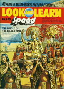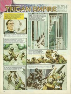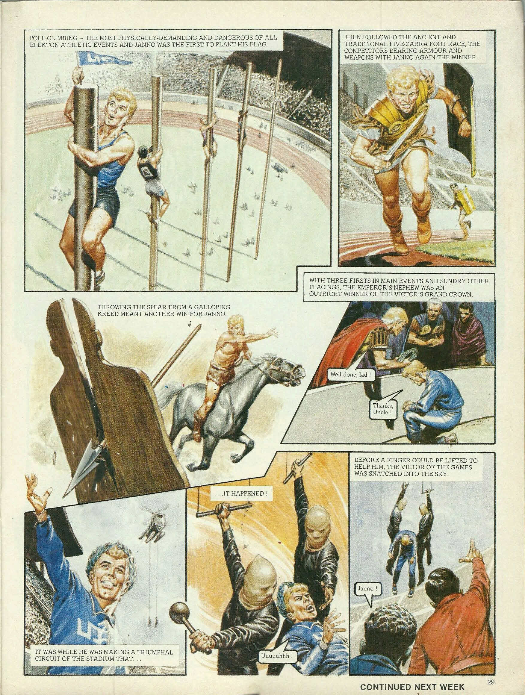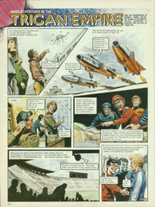 Posted on December 6, 2025December 9, 2025The Ultimate Collection (continued . . .) All Trigan City turned out to see the fossilised monster being carried off. They’ve got the Monster of Vorg ! The Air Fleet defences of the city were hastily sent up. Head for area three-five-one. Intercept, but do not open fire. Understood ? Order received and understood. Later . . . Leader of the interceptors reports they’ve lost contact sir. With a thing that size ? Impossible ! When it was all over, the experts went through the operation in detail and came up with a surprising conclusion. The thieves, whoever they are, made their escape in this direction. Shortly before passing the boundary of greater Trigan City, they disappeared from sight. So we estimate that “the Monster of Vorg” is still somewhere near at hand ! Speculation about the missing giant fossil was on everyone’s lips for a few days. The incident was then completely overshadowed by—the Trigan Empire Games ! People of the planet Elekton. We proudly present the twentieth Trigan Empire Games ! A star athlete and strong contender for the victor’s grand crown was Janno, the Emperor’s nephew. Competitors for the pole-climbing take your places. Good luck, Janno. Pole-climbing—the most physically-demanding and dangerous of all Elekton athletic events and Janno was the first to plant his flag. Then followed the ancient and traditional five-zarra foot race, the competitors bearing armour and weapons with Janno again the winner. Throwing the spear from a galloping kreed meant another win for Janno. With three firsts in main events and sundry other placings, the Emperor’s nephew was an outright winner of the victor’s grand crown. Well done, lad ! Thanks, Uncle ! It was while he was making a triumphal circuit of the stadium that . . . . . . It happened ! Uuuuuhhh ! Before a finger could be lifted to help him, the victor of the games was snatched into the sky. Janno ! This instalment was originally published in Look and Learn issue no. 725 on 6 December 1975.