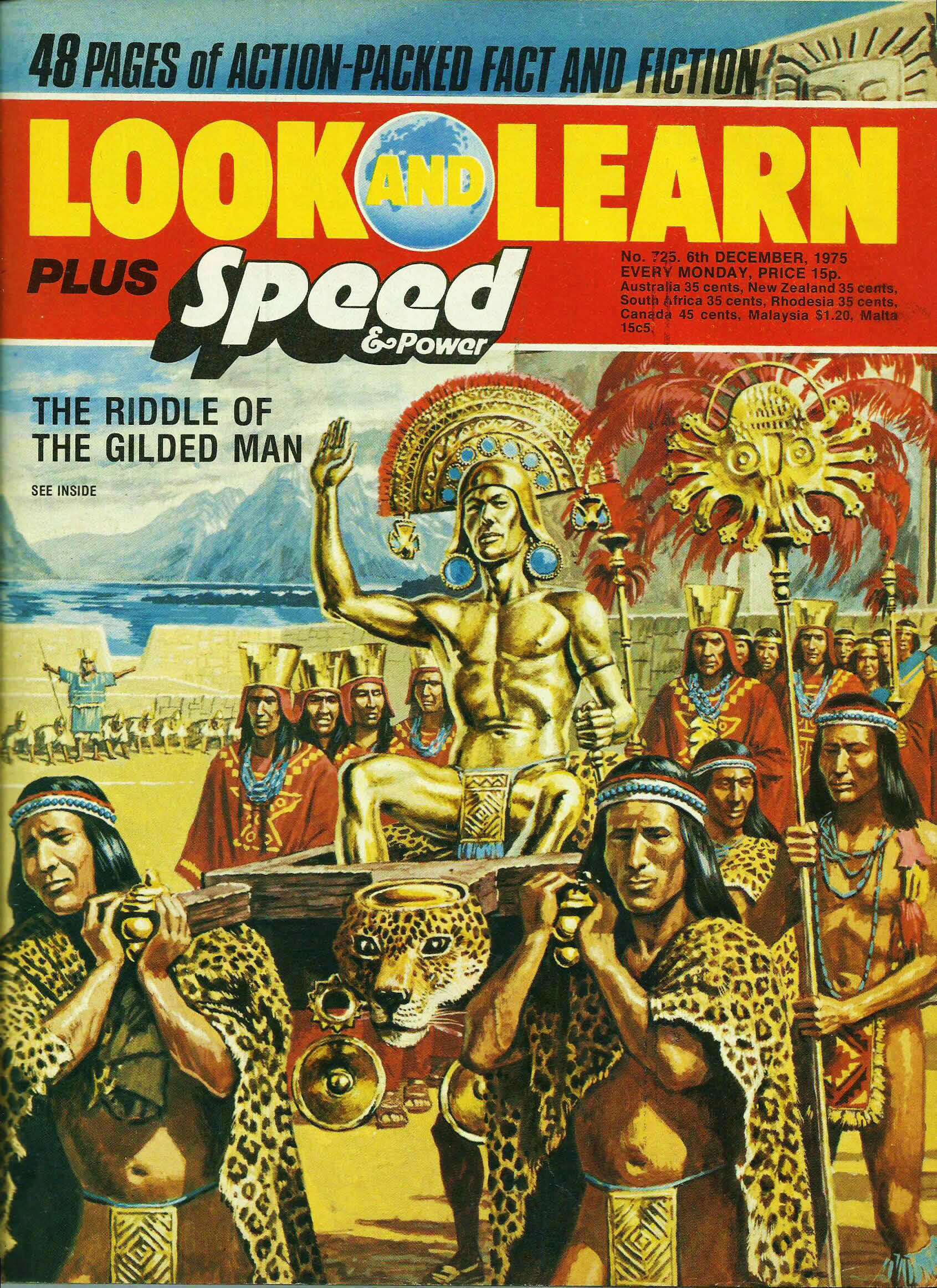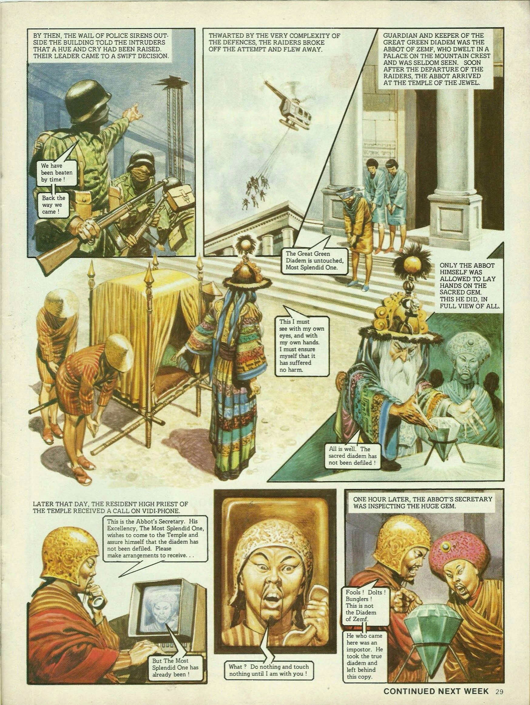 Posted on December 13, 2025December 13, 2025The Ultimate Collection (continued . . .) News of the snatching of the Emperor’s popular nephew was flashed round the planet. For the first time, there was a mention of a sinister connection between Janno’s disappearance and other sensational events. In this manner, Lord Janno was snatched up into the sky. It will be recalled that the Ultimate Aircraft and the Monster of Vorg were taken in the same way. Beyond the borders of the Trigan Empire, in the domains of Cato, the sacred city of Zemf was dominated by the mystical Temple of the Jewel, where thousands of worshippers a day filed past the great green glittering diadem. The diadem was guarded by the most sophisticated electronic devices. It was reckoned that the sheer complexity of the defences were sufficient to defeat any intruder. And then one day, they came. The invaders landed on the temple’s roof, and immediately ran into electronically discharged projectiles that turned the roof into a death-trap. By the time they had broken through into the temple, it had been emptied of panic-stricken worshippers. But their troubles had scarcely begun. When they attempted to mount the stairs to the diadem the stairs straightened out to become a slippery slide ! Aaaaaghhh ! Eeeeeghhh ! By then, the wail of police sirens outside the building told the intruders that a hue and cry had been raised. Their leader came to a swift decision. We have been beaten by time ! Back the way we came ! Thwarted by the very complexity of the defences, the raiders broke off the attempt and flew away. Guardian and keeper of the Great Green Diadem was the Abbot of Zemf, who dwelt in a palace on the mountain crest and was seldom seen. Soon after the departure of the raiders, the Abbot arrived at the Temple of the Jewel. The Great Green Diadem is untouched, Most Splendid One. This I must see with my own eyes, and with my own hands. I must ensure myself that it has suffered no harm. Only the Abbot himself was allowed to lay hands on the sacred gem. This he did, in full view of all. All is well. The sacred diadem has not been defiled ! Later that day, the resident high priest of the temple received a call on vidi-phone. This is the Abbot’s secretary. His Excellency, the Most Splendid One, wishes to come to the temple and assure himself that the diadem has not been defiled. Please make arrangements to receive . . . But the Most Splendid One has already been ! What ? Do nothing and touch nothing until I am with you ! One hour later, the Abbot’s secretary was inspecting the huge gem. Fools ! Dolts ! Bunglers ! This is not the Diadem of Zemf. He who came here was an impostor. He took the true diadem and left behind this copy. This instalment was originally published in Look and Learn issue no. 726 on 13 December 1975.