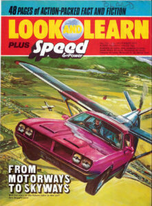 Posted on November 29, 2025November 30, 2025The Ultimate Collection All Elekton was tuned-in to one of the outstanding events of the age. We see Keren of the Air Fleet about to climb into the cockpit of what may prove to be the fastest craft that will ever fly in the atmosphere. Janno, the Emperor’s nephew, shook hands with his comrade. Janno was training for the forthcoming Trigan Empire Games, otherwise he would have been piloting “the Ultimate Aircraft”. I still feel as if I’ve stolen your place, Janno. Nonsense, Keren. You deserve to be the fastest pilot ever. Good luck to you. Keren made a circuit of the entire planet in one-sixteenth of the time it had ever been done before. In passing, the plane’s ultra-sonic boom caused extensive damage. The old tower’s going to fall ! Peric, Elekton’s top scientist, who had designed “the Ultimate Aircraft”, was furious—with himself. All right, say what you’re thinking. It’s too fast to be of any military use and too small to carry passengers. It’s an amusing toy, fit only for a museum ! The craft, destined to be stripped down to its component parts for close examination in Peric’s laboratory, was loaded on to a transporter and taken away from the air base. Some distance down the highway . . . Halt ! The unarmed crew of the transporter looked on while “the Ultimate Aircraft” was attached to the heli-jet and carried skywards. The snatching of the wonder plane was a sensation throughout Elekton at first, but as the lunar months went by, another sensation claimed the attention of the masses. Here, on this site in the wilderness of Vorg, has been uncovered the fossilised remains of the earliest four-legged creature to inhabit our planet . . . the Monster of Vorg ! “The Monster of Vorg” was exhibited in a specially constructed building in Trigan City. It became one of the sights of the planet. Several weeks later, from out of a peaceful sky, a force of armed warriors descended. Acting swiftly and ruthlessly dealing with the slightest opposition, they cleared visitors from the vast building that housed the monster. Aaaagh ! Explosive charges brought the transparent roof crashing down. Then, from out of the wreckage rose “the Monster of Vorg” ! This instalment was originally published in Look and Learn issue no. 724 on 29 November 1975.