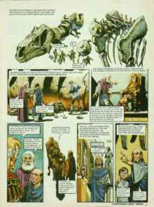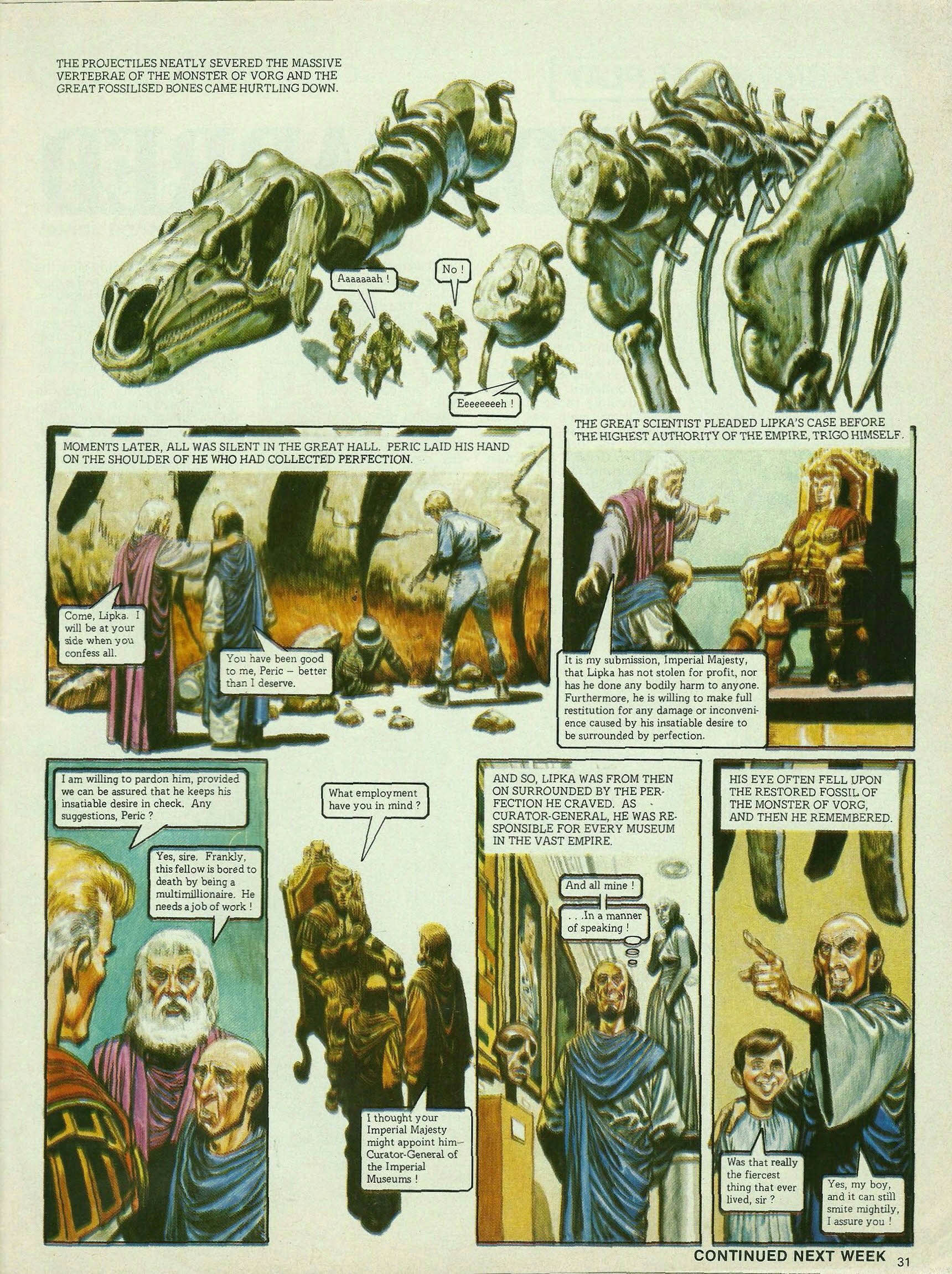 Lipka let out a wail of anguish as one of the guards picked up the Great Green Diadem. We’ll cut this up and dispose of it. It will fetch enough money to keep us in luxury for the rest of our lives. No! Do not harm The diadem! It is utter perfection! He was felled by a brutal blow. Babbling fool! What do we care for perfection? We’ve done your bidding, and now we’re taking our payment. Loaded weapons were trained on the helpless pair. And now we’ll still your wagging tongues for ever! But one person had been entirely overlooked—Janno. And he burst upon the scene like a thunderbolt. Uuuuuuugh! Eeeeeeeeeeghh! The remaining guards rushed forward to deal with the young Trigan. He must have broken out of his cage. Seize him! Picking up a fallen weapon, Janno took hasty aim.The projectiles neatly severed the massive vertebrae of the Monster of Vorg and the great fossilised bones came hurtling down. Aaaaaaah! No! Eeeeeeeeh! Moments later, all was silent in the great hall. Peric laid his hand on the shoulder of he who had collected perfection. Come, Lipka. I will be at your side when you confess all. You have been good to me, Peric—better than I deserve. The great scientist pleaded Lipka’s case before the highest authority of the empire, Trigo himself. It is my submission, Imperial Majesty, that Lipka has not stolen for profit, nor has he done any bodily harm to anyone. Furthermore, he is willing to make full restitution for any damage or inconvenience caused by his insatiable desire to be surrounded by perfection. I am willing to pardon him, provided we can be assured that he keeps his insatiable desire in check. Any suggestions, Peric? Yes, Sire. Frankly, this fellow is bored to death by being a multimillionaire. He needs a job of work! What employment have you in mind? I thought your Imperial Majesty might appoint him—Curator-General of the Imperial Museums! And so, Lipka was from then on surrounded by the perfection he craved. As Curator-General, he was responsible for every museum in the vast empire. And all mine! . . . In a manner of speaking! His eye often fell upon the restored fossil of the Monster of Vorg, and then he remembered. Was that really the fiercest thing that ever lived, sir? Yes, my boy, and it can still smite mightily, I assure you!