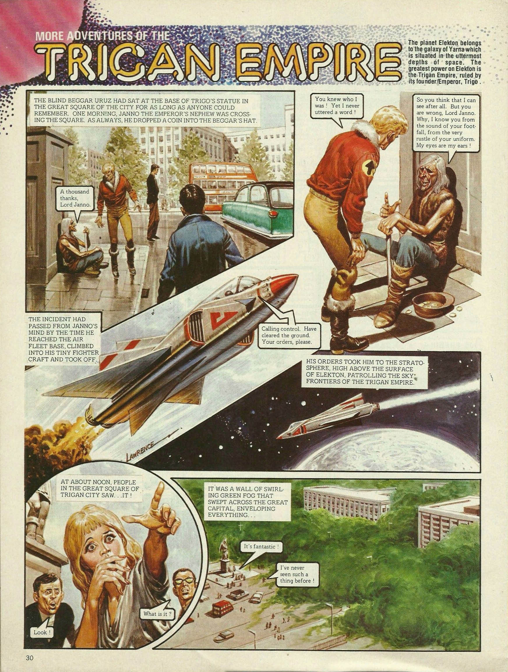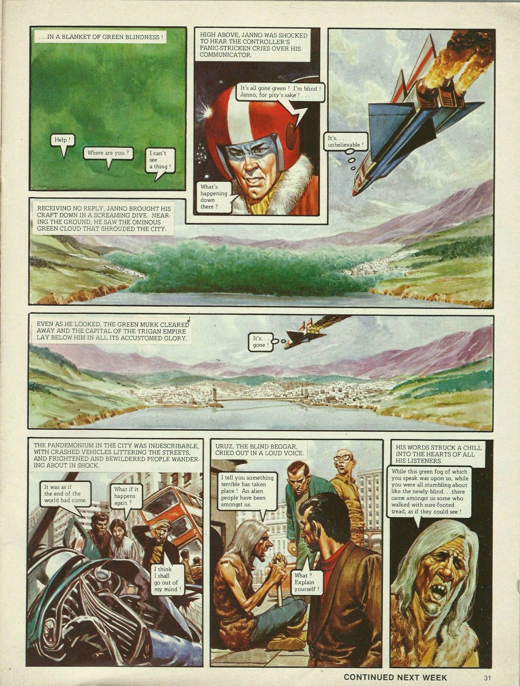 . . . in a blanket of green blindness! Help! Where are you? I can’t see a thing! High above, Janno was shocked to hear the controller’s panic-stricken cries over his communicator. It’s all gone green! I’m blind! Janno, for pity’s sake! . . . What’s happening down there? Receiving no reply, Janno brought his craft down in a screaming dive. Nearing the ground, he saw the ominous green cloud that shrouded the city. It’s . . . unbelievable! Even as he looked, the green murk cleared away and the capital of the Trigan Empire lay below him in all its accustomed glory. It’s . . . gone! The pandemonium in the city was indescribable, with crashed vehicles littering the streets, and frightened and bewildered people wandering about in shock. It was as if the end of the world had come. What if it happens again? I think I shall go out of my mind! Uruz, the blind beggar, cried out in a loud voice. I tell you something terrible has taken place! An alien people have been amongst us. What? Explain yourself! His words struck a chill into the hearts of all his listeners. While this green fog of which you speak was upon us, while you were all stumbling about like the newly-blind . . . there came amongst us some who walked with sure-footed tread, as if they could see!