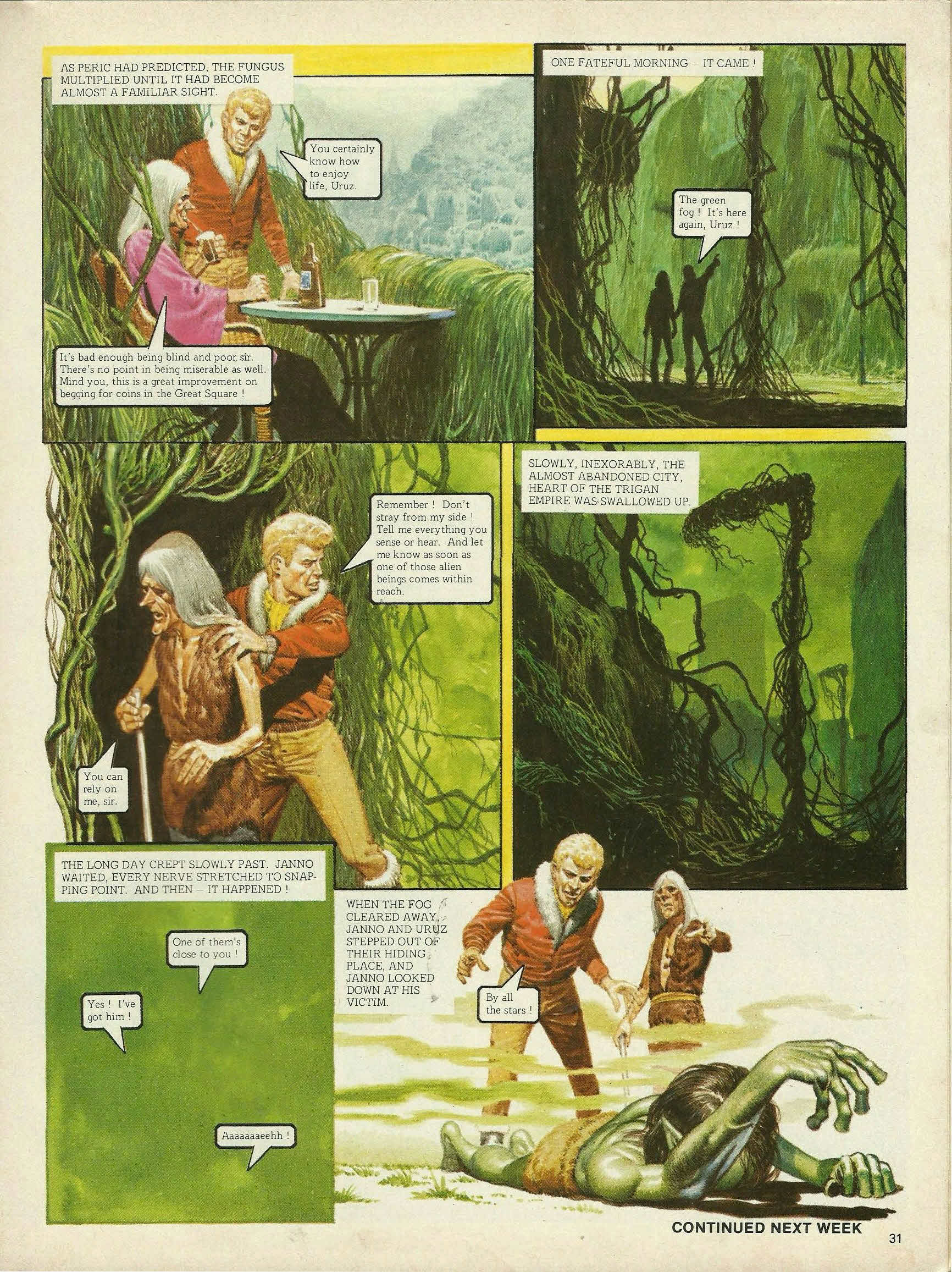 Guided by his questioner, Uruz told of all that he had heard and sensed during the periods of green fog. And you say these alien beings walk the streets? In their thousands. And all of them . . . working. Working at what, may I ask? Collecting the green fungus! Afterwards, the great scientist Peric gave his opinion to the Emperor. Uruz’s evidence tallies with the facts. I tell you that when the fungus has grown to maturity again, the green fog will come back and the fungus will be gathered once more. This green fungus has turned Elekton’s mightiest city into a shambles and reduced the empire to chaos! It can’t be allowed to continue! Who are these alien beings? To find out, Imperial Majesty, we must capture one of them! And, with your permission, I have a plan. . . Later, Uruz was summoned to Trigo’s study. I think you know Lord Janno? Of course. Doesn’t he drop a coin into my hat every time he passes my pitch in the Great Square? From now on, Uruz, you will not leave Janno’s side, day or night. Do you understand? Companion to a member of the Imperial Family! My, I have come up in the world—and me a poor blind beggar! In the lunar month that followed, Janno had a constant companion. Many’s the time I’ve heard you screeching past, and folks have said, “there goes Lord Janno trying to break his neck again”. But I never thought I’d be in here with you. Oh, shut up or belt up — one thing or the other!As Peric had predicted, the fungus multiplied until it had become almost a familiar sight. You certainly know how to enjoy life, Uruz. It’s bad enough being blind and poor, sir. There’s no point in being miserable as well. Mind you, this is a great improvement on begging for coins in the Great Square! One fateful morning—it came! The green fog! It’s here again, Uruz! Remember! Don’t stray from my side! Tell me everything you sense or hear. And let me know as soon as one of those alien beings comes within reach. You can rely on me, sir. Slowly, inexorably, the almost abandoned city, heart of the Trigan empire, was swallowed up. The long day crept slowly past. Janno waited, every nerve stretched to snapping point. And then—it happened! One of them’s close to you! Yes! I’ve got him! Aaaaaaaeehh! When the fog cleared away, Janno and Uruz stepped out of their hiding place, and Janno looked down at his victim. By all the stars!