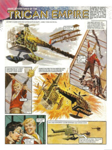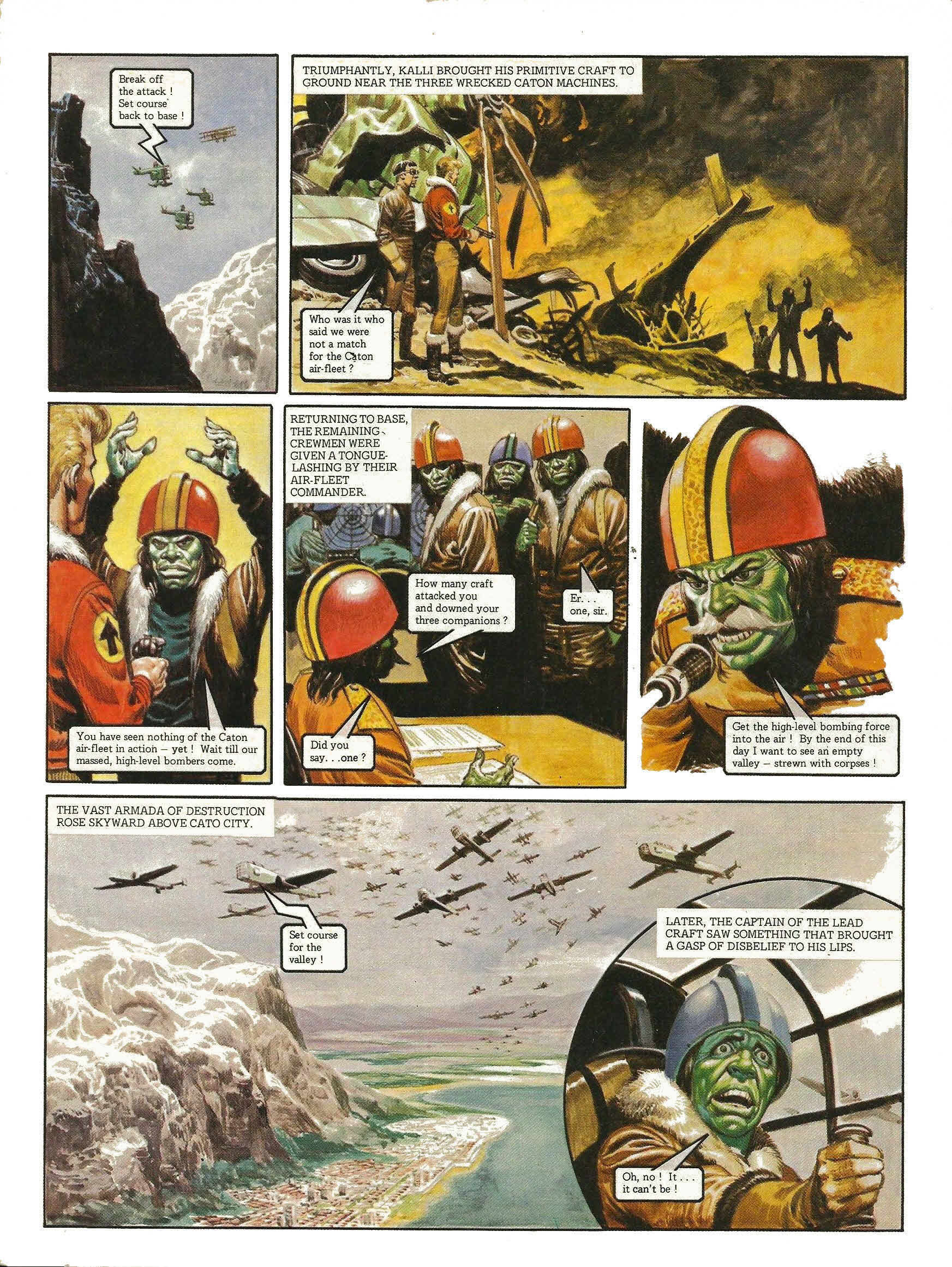 At dawn the following day, the massed air fleet of Cato flew low over the valley of the Nobes in a brutal display of power. The people of the valley stared up, awestruck. It can’t be true! It’s some kind of trick! Living creatures can’t fly so high and so fast! Later, the Caton emissaries delivered an ultimatum to the Nobes. The Nobes will acknowledge the overlordship of the Caton state, or the people and cities of the valley will be destroyed from the air. What you suggest is absurd. Next, the emissaries of the Trigan Empire, with Janno as spokesman. The Trigan Empire offers you the protection of its power. All you have to do is ask. I thank the Trigan Empire, but we can look after ourselves. After all, we, too, have a superior technology. Think, for instance of our air fleet! As Janno said later, to his new friend Kalli. Do you think you could defend the valley for any length of time with that collection of museum pieces? We can but do our best. If the Catons come, I, for one, will take the air against them! Then I request the honour to accompany you, Kalli! Back in far-off Trigan City, the latest news reached the Emperor Trigo and his advisors. Well, gentlemen, what can we do? The Nobes have rejected our help. If our forces entered now, we would be as guilty of invasion as the Catons. Then the Catons have outmanoeuvred us. Order Janno and Peric to return.